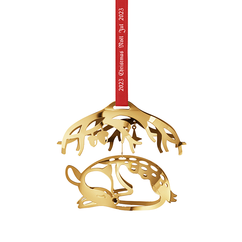 En lille hjort ligger krøllet sammen, og får sig en tiltrængt lur under snedækkede grene i skoven. Fra grenene hænger der to små agern og en julestjerne, der holder den sovende hjort ved selskab. Designeren Sanne Lund Traberg har fundet sin inspiration i en snedækket skov, og med dette som primær inspirationskilde er Georg Jensens julesamleobjekter 2023 blevet til. Der medfølger et klassisk rødt bånd samt et bånd i en skøn varm grøn, som er årets julefarve. Juleuroen består af to dele – den lille søde hjort og grenene, som hjorten putter sig under. Grenene kan tages af, og båndet kan hænges direkte i hjorten og/eller i grenene. På denne måde får du faktisk to juleuroer i én. Denne yndige Georg Jensen juleuro er den perfekte gave til samleren eller til det unge menneske, der er flyttet hjemmefra eller til familien, der netop har fået nyt hjem. Juleuroen vil aldrig gå af mode, og vil altid minde om året 2023.